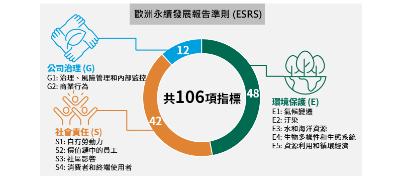 以ESG資產規模而言,歐洲地區不僅逐季持續成長,且遙遙領先全球最大經濟體美國。而作為ESG領頭羊的歐盟,自2023年起施行的【企業永續報告發布指令 (CSRD)】規範企業以統一標準發布永續報告,大型歐盟企業最快需於2025年以此規範發佈2024年的報告,且非歐盟企業也將受影響,逐年將涵蓋超過5萬間企業。