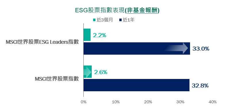美國總統大選落幕,由共和黨參選人川普勝出,其主張終止現有的綠色環境政策,表示政府不該在環境方面約束企業,以致近三個月ESG Leaders指數表現小幅落後世界指數0.4%;但長期來看,美國經濟數據表現有撐、通膨逐步回落,且Fed也於9月與11月分別降息兩碼及一碼,令市場樂觀情緒湧現,加之AI浪潮席捲全球,帶動ESG Leaders及世界指數近一年雙雙收漲逾30%。