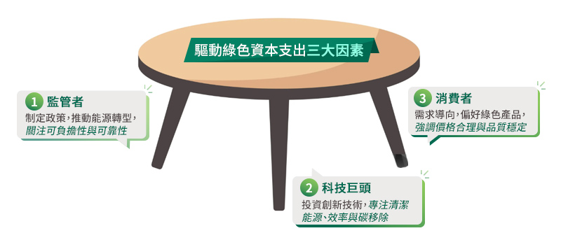 由於川普的能源政策偏向石油、天然氣等傳統能源,預計將撤銷目前嚴格的排放法規,並削減降低通膨法案(IRA)當中與乾淨能源相關的資金。儘管川普極端政策的不確定性,引發短期市場波動,但高盛認為驅動綠色資本支出的結構性因素如「監管者政策、科技巨頭技術創新、消費者需求」已經根深蒂固,並在全球範圍內達成共識。
