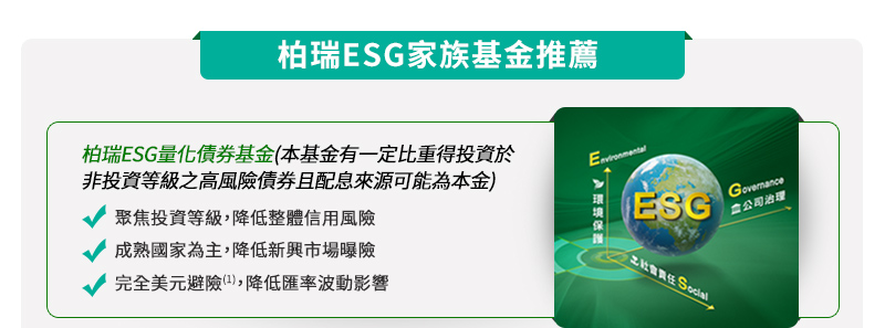 資料來源:柏瑞投信整理,2024/10/31。圖文僅供參考,本公司未藉此作任何徵求、推薦及獲利之保證。投資人申購本基金係持有基金受益憑證,而非本文提及之投資資產或標的。 (1)本基金雖有避險策略,但不保證完全規避匯率風險,實際仍將隨市況波動與市場看法進行調整。 (2)台灣No.1 首發ESG全球股票基金係根據SITCA分類,境內全球股票型基金分類中符合ESG投資逾70%、且採取量化策略操作之股票基金,柏瑞為第一檔首發,2021/12/31。註:本基金成立6個月後,應有至少70%價值之部位投資於符合ESG投資概念之有價證券。符合ESG投資概念之相關定義說明請詳閱公開說明書。(3)此指巴黎協定,是由聯合國195個成員國於2015年12月12日在聯合國氣候峰會上通過的氣候協議。本基金設有ESG績效指標為MSCI全球巴黎協定氣候指數,作為年度減碳比率之指標參考,非作為基金績效比較用途。