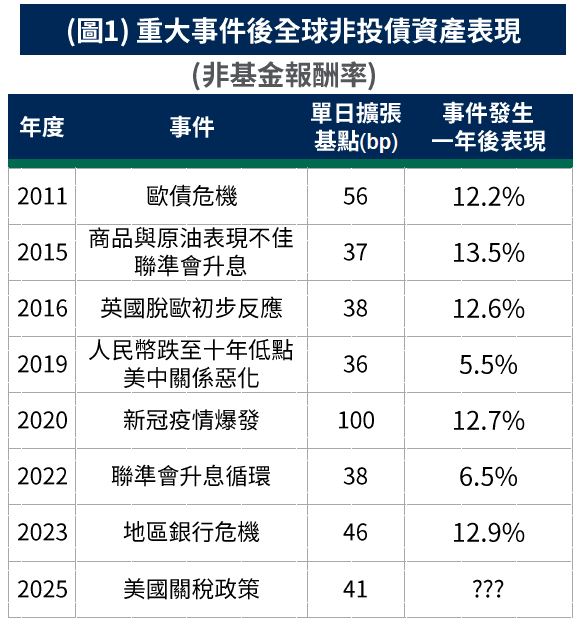 •當市場風險性事件發生,也往往伴隨著投資契機。回顧過往利差大幅擴張的事件發生後,未來1年指數多有正報酬的表現(圖1),反映在市場擔憂情緒消彌後,資產表現有望逐步回穩。