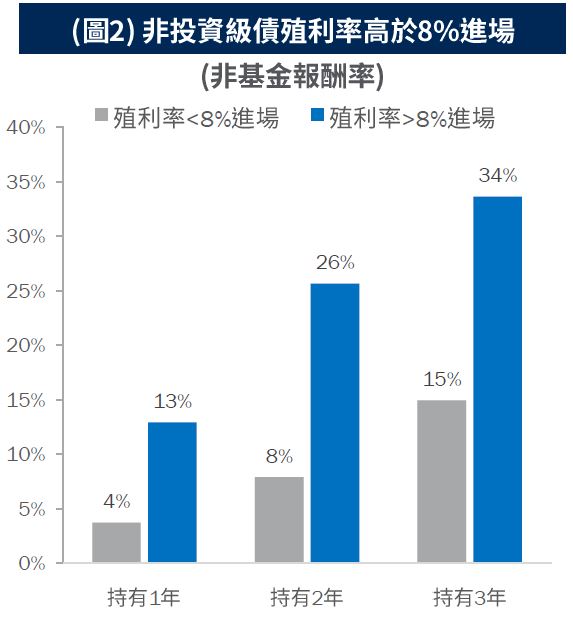 •當前殖利率水準除有長期吸引力外,回顧當殖利率高於8%的環境下進場佈局,全球非投資級債在未來的1至3年有更亮眼的平均報酬表現 (圖2)。