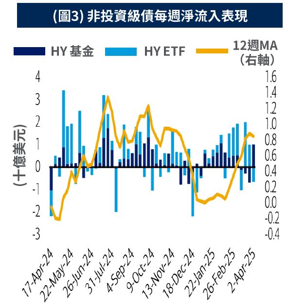 ◎資金連續兩週流入非投資級債截至4月2日,美國非投資級債呈連續3週淨流入,其中ETF當週流出6.6億美元;基金流入10億美元,年迄今累積流入108億美元(圖3)。