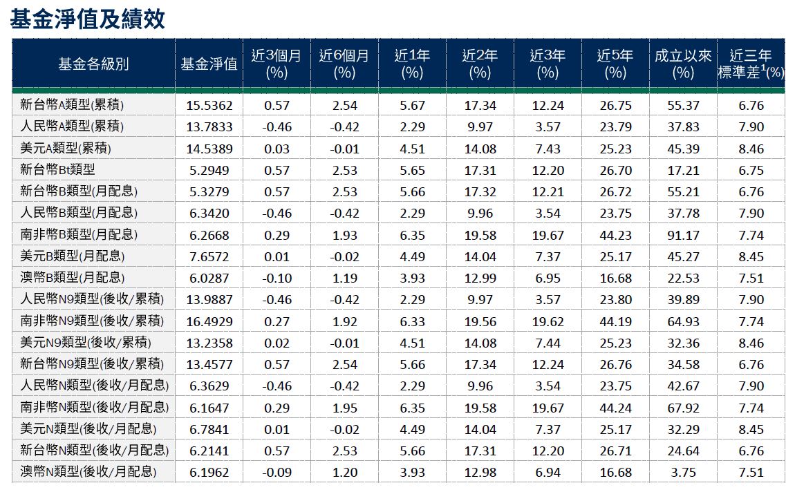 避險比率:新台幣級別避險比例為34.36%,人民幣級別避險比例87.34%,澳幣級別避險比例83.36%,南非幣級別避險比例83.86%。