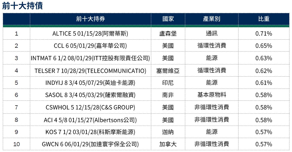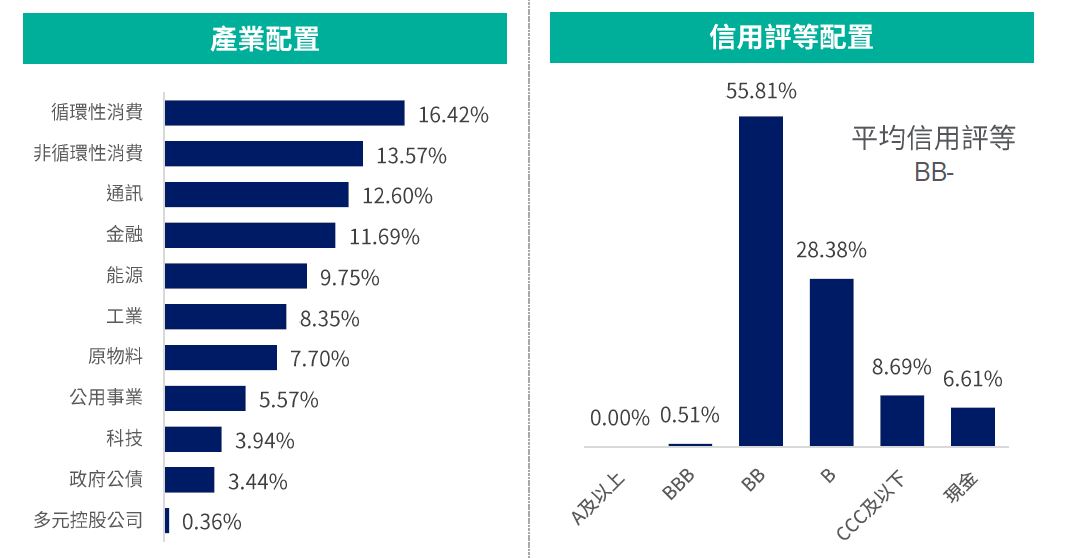 操作說明2:偏好循環性消費、非循環性消費、通訊產業;存續期間維持中性,目前3.36年;信用評等聚焦BB與B評級資產,平均信評維持BB-。*(詳見下方註釋)