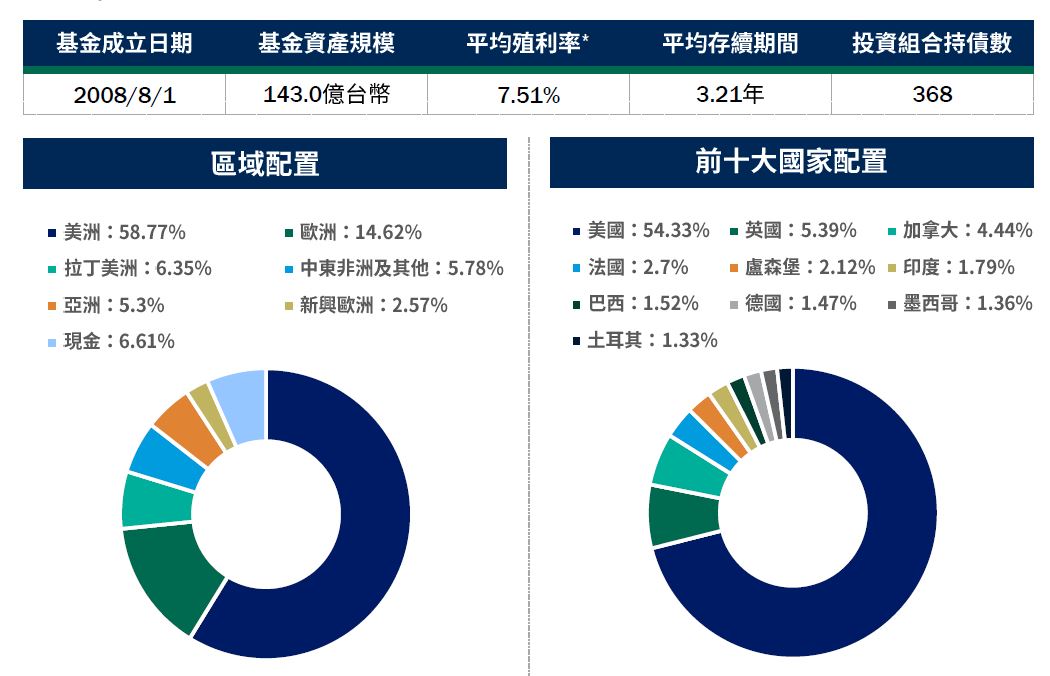 資料來源:柏瑞投信,2025/2/28。配置會隨市況而改變,本公司不另行通知。非投資等級債券仍有相關風險,請投資前審慎評估風險承受度。*平均殖利率係假設基金投資組合中各債券持有至到期所獲得的收益,包括各期利息收入的再投資。相當於按當前(計算日)市場價格購買並且一直持有到滿期時可獲得的年均報酬率。基金平均殖利率會隨著個別債券價格或票息等因素變動,不代表基金實質報酬率及未來走勢。本基金之投資組合平均信評計算方式:若同一標的有多家信評公司給予不同信評時,按高低順序取最高信評。將個別債券按上述方式定義之信評等級,參酌其相對應之評分(例如:AAA為1分、AA+為2分,依此類推),並依標的市值佔淨資產價值之比重(包含現金),加權平均後無條件捨去,以此數值結果對應信評評分等級,及自投資組合確立後依投資標的信評揭示相關比重。投資人申購本基金係持有基金受益憑證,而非本文提及之投資資產或標的。