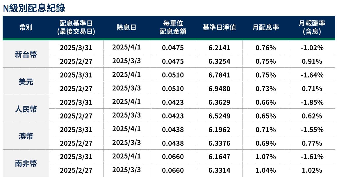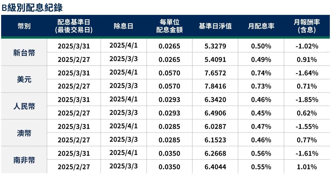 月配息率=(每單位配息金額÷除息日前一日淨值)×100%。 月報酬率(含息)=(月底淨值-上月底淨值+上月配息金額)÷上月底淨值。資料來源:柏瑞投信,2025/4。新台幣/美元/人民幣/澳幣/南非幣計價。基金配息不代表基金實際報酬,且過去配息不代表未來配息;基金淨值可能因市場因素而上下波動。積極配息的基金未必適合投資人,請投資前審慎評估。配息政策請詳閱各基金公開說明書;配息組成項目請至公司網站查詢。基金的配息可能由基金的收益或本金支付。任何涉及由本金支出的部分,可能導致原始投資金額減損。基金進行配息前未先扣除應負擔之相關費用。