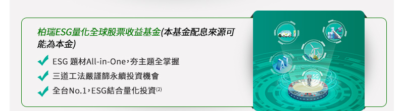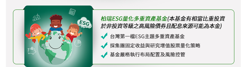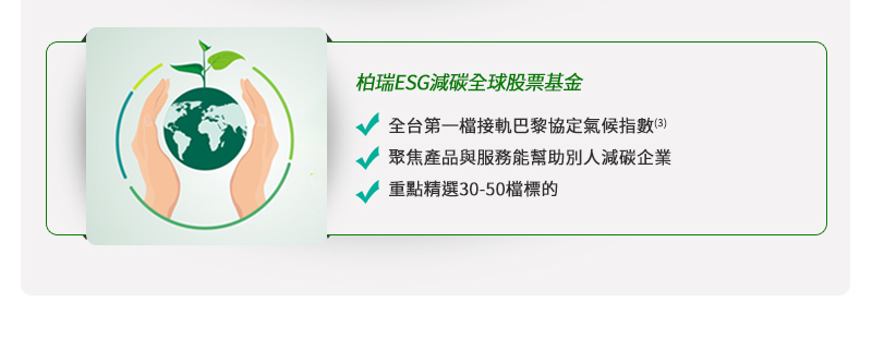 資料來源:柏瑞投信整理,2025/7/31。圖文僅供參考,本公司未藉此作任何徵求、推薦及獲利之保證。投資人申購本基金係持有基金受益憑證,而非本文提及之投資資產或標的。 (1)本基金雖有避險策略,但不保證完全規避匯率風險,實際仍將隨市況波動與市場看法進行調整。 (2)台灣No.1 首發ESG全球股票基金係根據SITCA分類,境內全球股票型基金分類中符合ESG投資逾70%、且採取量化策略操作之股票基金,柏瑞為第一檔首發,2021/12/31。註:本基金成立6個月後,應有至少70%價值之部位投資於符合ESG投資概念之有價證券。符合ESG投資概念之相關定義說明請詳閱公開說明書。(3)此指巴黎協定,是由聯合國195個成員國於2015年12月12日在聯合國氣候峰會上通過的氣候協議。本基金設有ESG績效指標為MSCI全球巴黎協定氣候指數,作為年度減碳比率之指標參考,非作為基金績效比較用途。