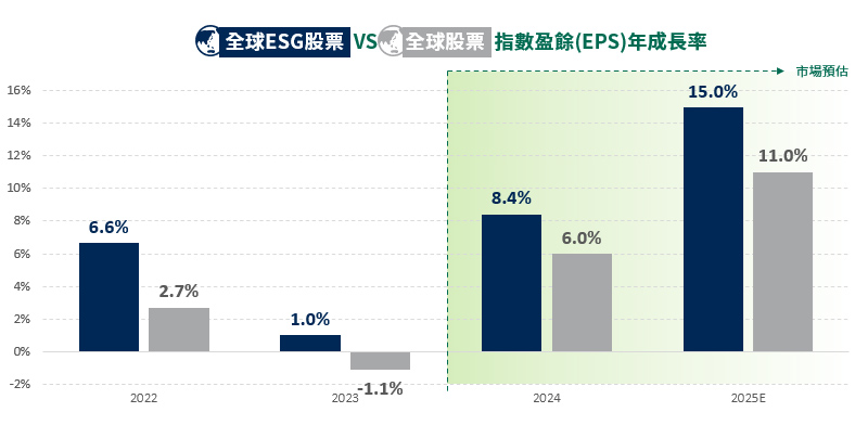 全球央行已邁入降息循環,且市場預期美國聯準會(Fed)於9月降息,令美國企業貸款壓力得以減緩。此外,觀察美國經濟仍具韌性,企業財報表現穩健,預估全球ESG股票指數今年的EPS成長率,可望超越去年的8.4%來到雙位數的15%,同時優於全球股票指數的11%。