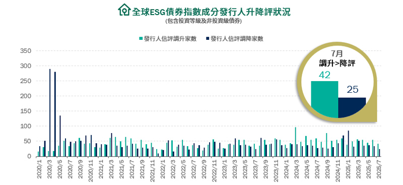 儘管受到關稅議題干擾,根據Bloomberg統計,今年7月ESG債券指數成分發行企業中,信評被調升家數高於被降評家數,顯示企業基本面依然相對穩健。此外,全球ESG企業債券指數的平均信評為投資等級,信用風險相對較低。