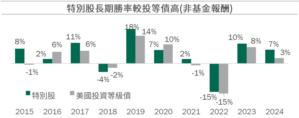 資料來源:Bloomberg,2014/12/31-2024/12/31。特別股以ICE BofA固定利率優先證券指數為參考,美國投資級企業債以ICE BofA美國投資級企業債指數為參考,皆非本基金報酬指標。特別股指數截至2025/10/31指數之平均信用評級為BBB。