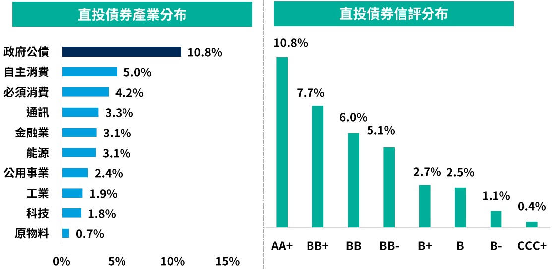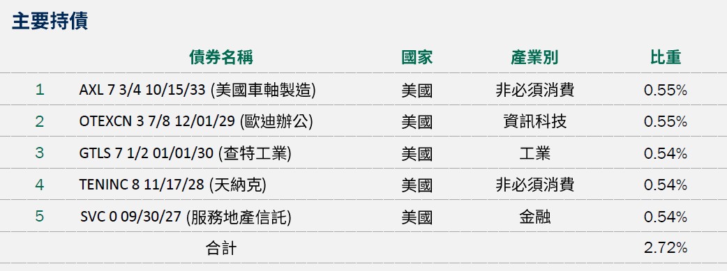 資料來源:柏瑞投信,2025/12/11。配置會隨市況而改變,本公司不另行通知。非投資等級債券仍有相關風險,請投資前審慎評估風險承受度。*平均殖利率係假設基金投資組合中各債券持有至到期所獲得的收益,包括各期利息收入的再投資。相當於按當前(計算日)市場價格購買並且一直持有到滿期時可獲得的年均報酬率。1.基金平均殖利率會隨著個別債券價格或票息等因素變動,不代表基金實質報酬率及未來走勢。2.本基金之投資組合平均信評計算方式:若同一標的有多家信評公司給予不同信評時,按高低順序取最高信評。將個別債券按上述方式定義之信評等級,參酌其相對應之評分(例如:AAA為1分、AA+為2分,依此類推),並依標的市值佔債券部位淨資產價值之比重(包含現金),加權平均後無條件捨去,以此數值結果對應信評評分等級,及自投資組合確立後依投資標的信評揭示相關比重。投資人申購本基金係持有基金受益憑證,而非本文提及之投資資產或標的。投資人應留意衍生性工具/證券相關商品等槓桿投資策略所可能產生之投資風險,詳見公開說明書。