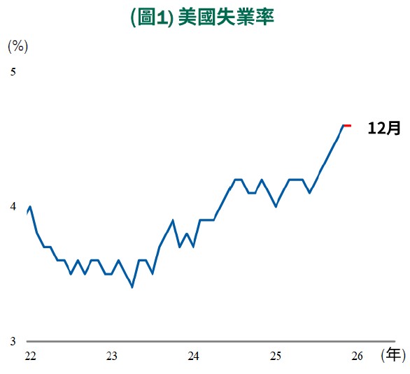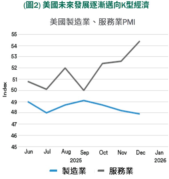 •經濟:美國經濟呈現明顯的K型分化(圖2)。服務業指數持續上行,反映消費需求、就業與內需活動仍具韌性,成為經濟主要支撐;相對地,製造業指數偏弱,顯示高利率環境與庫存調整仍壓抑企業投資動能。短期美國經濟成長,預期仍將由服務業主導。