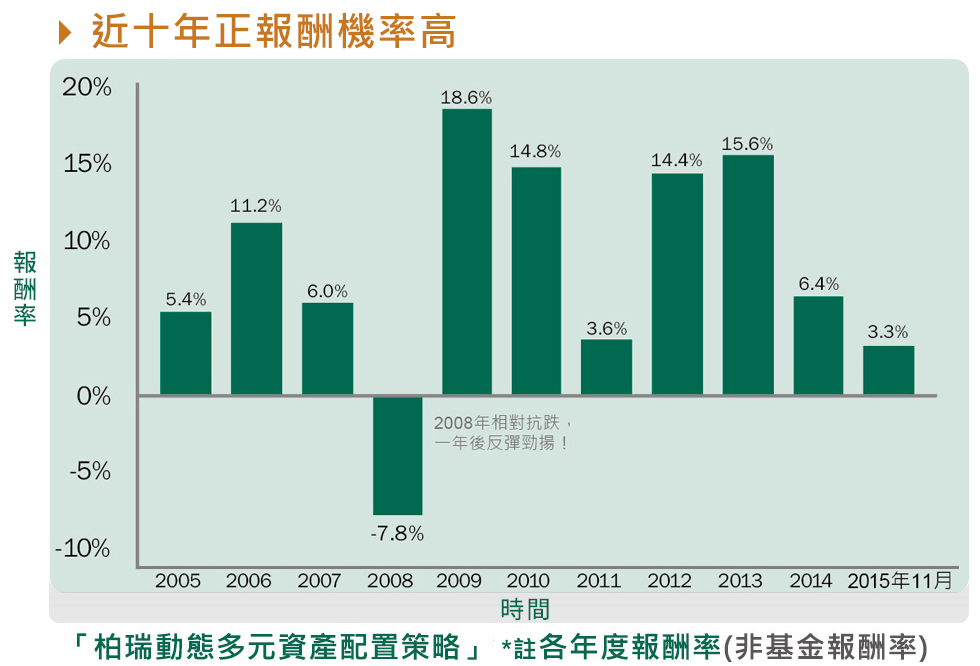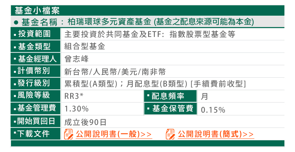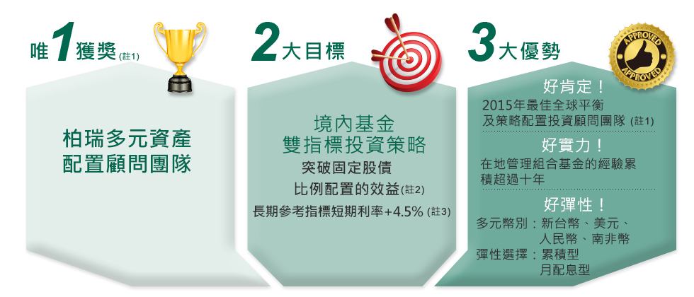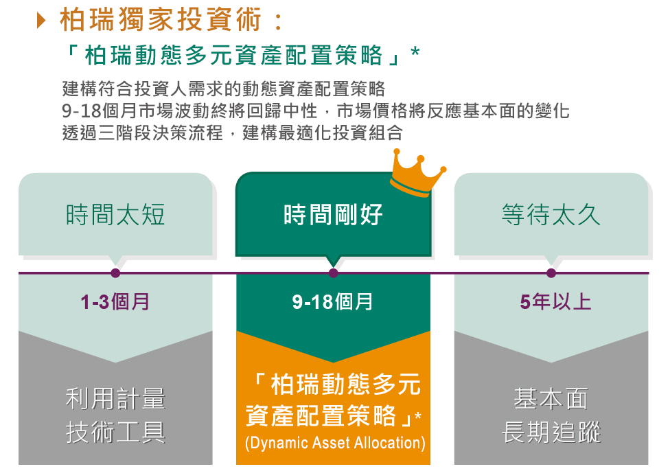 *註:「柏瑞動態多元資產配置策略」係指由國外投資顧問公司-柏瑞投資之全球多元資產配置團隊,根據三階段投資流程、短期波動與長期趨勢等,建構符合投資人需求的資產配置投資策略,詳請參閱「柏瑞獨家投資術」之說明。