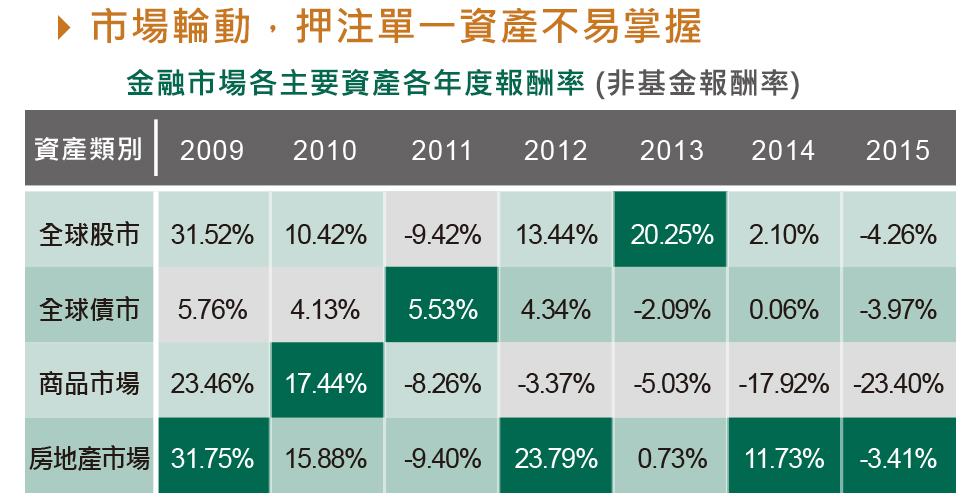 註:綠底白字的區域為當年度報酬率最高的主要資產類別。