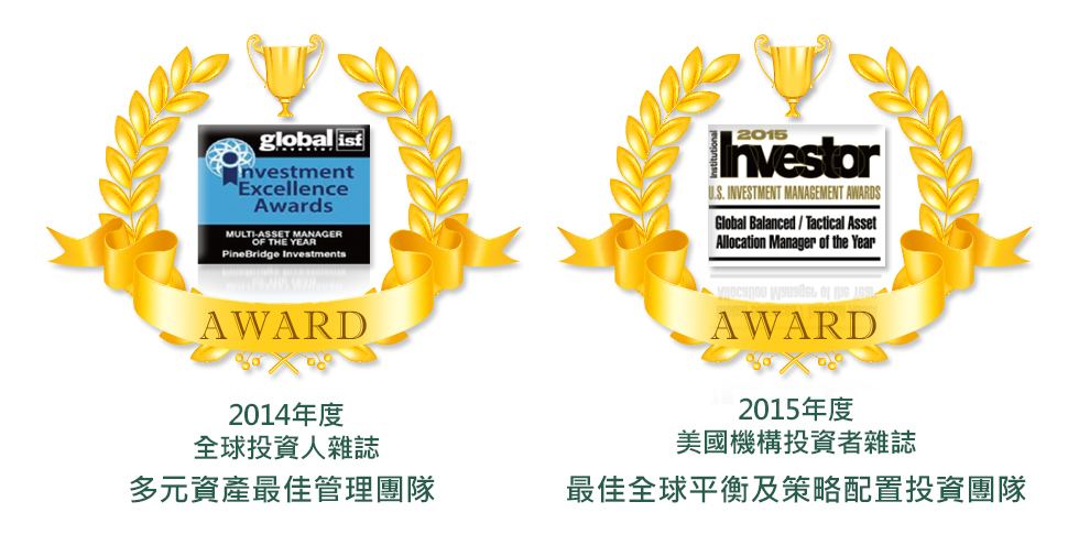 註1:資料來源為美國機構投資者雜誌,得獎類別為「全球平衡暨資產配置商品類別」,2015/09/30。過去績效不代表未來收益之保證。柏瑞投資有限責任公司(PineBridge Investment LLC)為本基金投資顧問,是2015年美國機構投資者雜誌所頒獎項中,資產配置獲獎團隊。