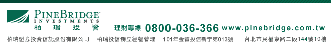 | 柏瑞投資由旗下多家國際公司組成,並致力為世界各地之客戶提供專業投資建議、投資產品及資產管理服務。柏瑞投資乃是PineBridge Investments IP Holding Company Limited之註冊商標。本基金經金管會核准或同意生效,惟並不表示絕無風險。基金經理公司以往之經理績效不保證基金之最低投資收益;基金經理公司除盡善良管理人之注意義務外,不負責本基金之盈虧,亦不保證最低之收益,投資人申購前應詳閱基金公開說明書。