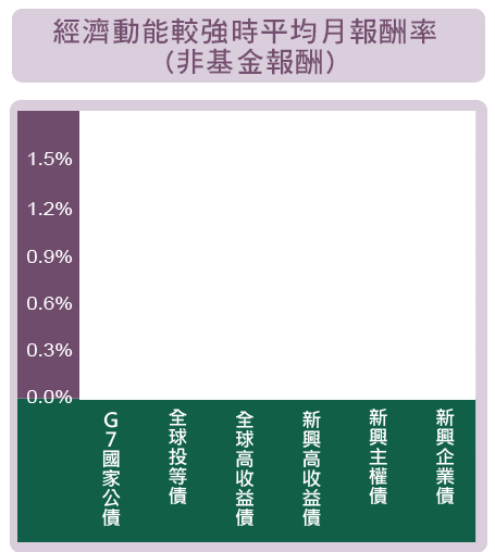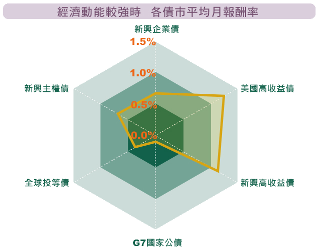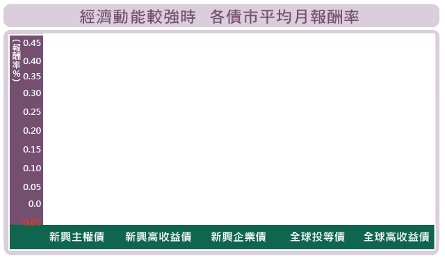 高收益債長期以來與景氣有較強連動性,在經濟動能較強期間表現多會優於政府公債與投資等級債。