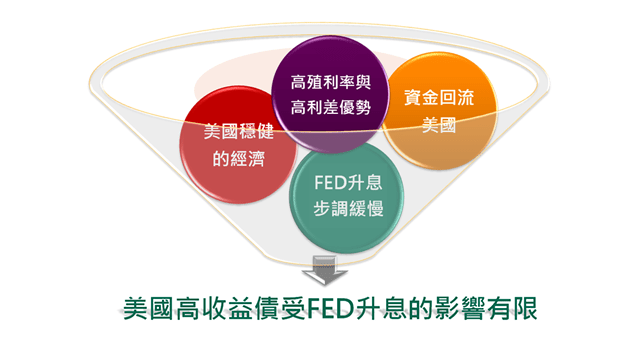 FED升息時多意味著美國景氣狀況良好,加上國際資金的回流,讓當地資產有相對較佳的表現;同時高收益債亦具有高殖利率/利差的優勢,有助緩衝公債利率上升的衝擊。