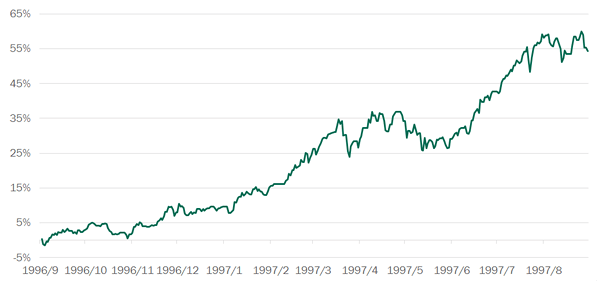 MSCI在1996年首度將台灣納入新興市場指數,其後1年台灣加權股價指數漲幅高達54.3%。