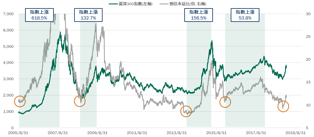 A股本益比及股價淨值比已接近歷次市場底部水準,股市在歷次觸及底部後平均上漲240%,反彈時間平均達1.6年*。
