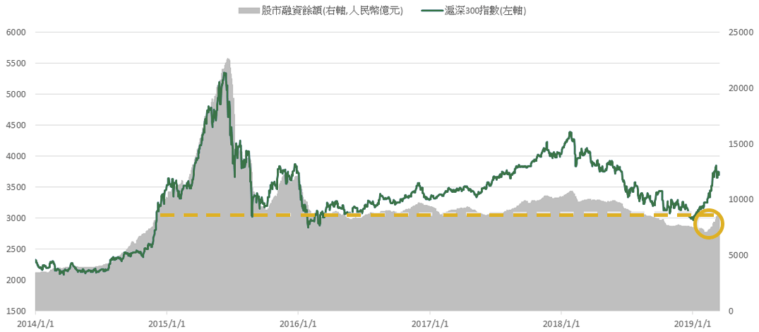 *政策底部是指該國政府政策轉向的時點,此處僅討論該國政策由偏緊轉向寬鬆的情況。資料來源:Bloomberg ,柏瑞投信整理,2019/03/11。用以衡量散戶信心的融資餘額在去年的低迷走勢降至2014年以來的最低水準,近期已轉折向上,顯示散戶信心歸隊。而目前融資餘額還在相對低檔,沒有過熱的跡象,表示行情應該尚未結束。