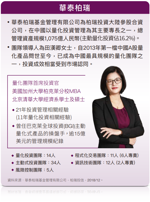 *註:基金投資顧問為華泰柏瑞基金管理有限公司。此報酬試算僅為假設情境下的模擬計算,並非基金之預期報酬。「華泰柏瑞A股量化策略」係指基金投資顧問華泰柏瑞透過量化模型所建構的策略。其所採用之模型為以基本面分析為基礎的多因子Alpha量化投資模型,該模型針對超過70個因子進行量化分析,並對市場、主題、產業與其它風險因子調整風險曝露程度,力求擊敗基準指數。本「華泰柏瑞A股量化策略」之基準指數為滬深300指數。資料來源:Bloomberg,2013/8/9~2019/02/28,人民幣計價報酬。