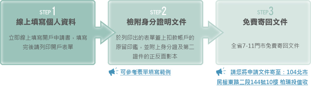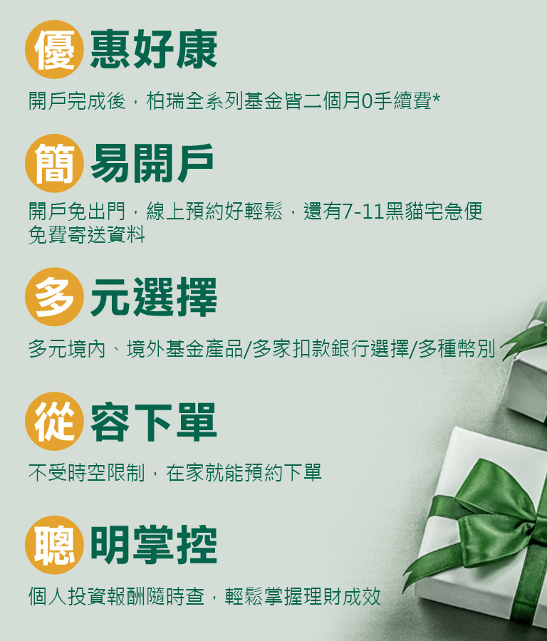 2021/1/1~2021/12/31成功開立柏瑞投信網路交易戶,可取得二個月全系列(註)基金不限筆數,不限單筆或定期定額「線上申購」0手續費。