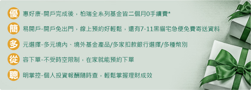 全球經濟溫和成長的環境下,你是否已開始投資?或者還在觀望中?無論您現在是否已投資,機會永遠是留給準備好的人,即日起開立柏瑞網路交易戶,全系列基金享2個月免手續費,建議投資人提早開戸,作好隨時進場的準備。