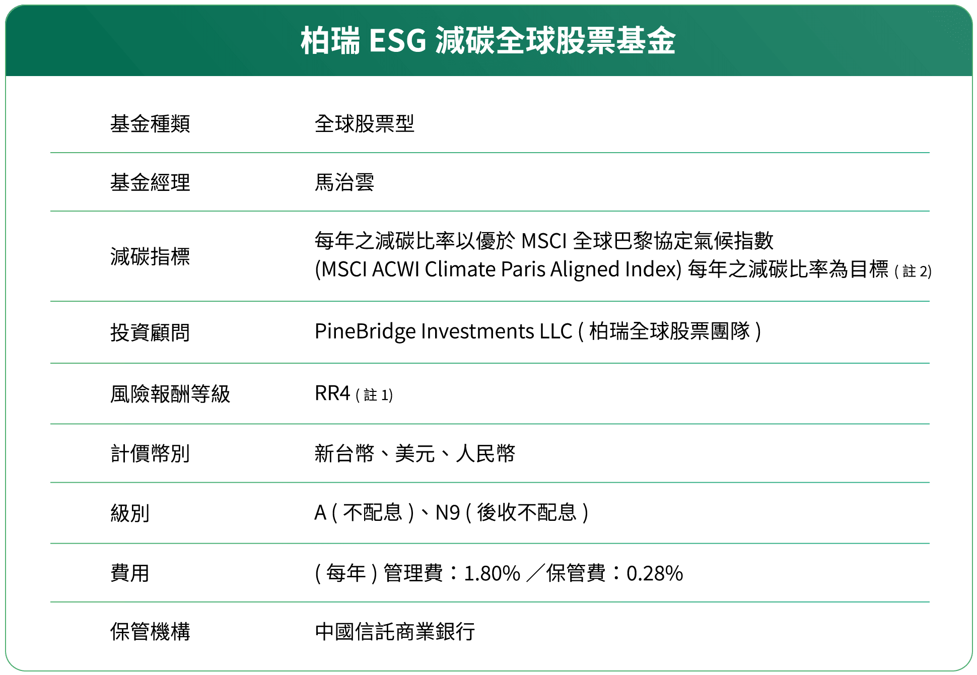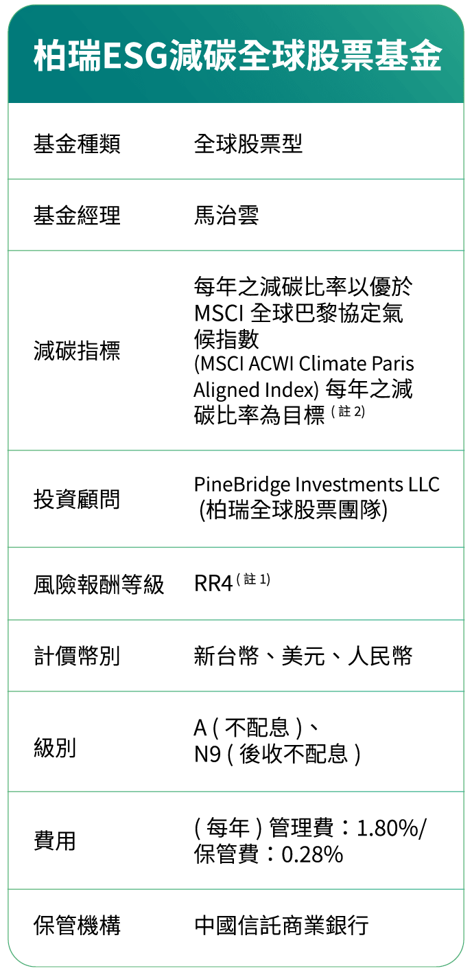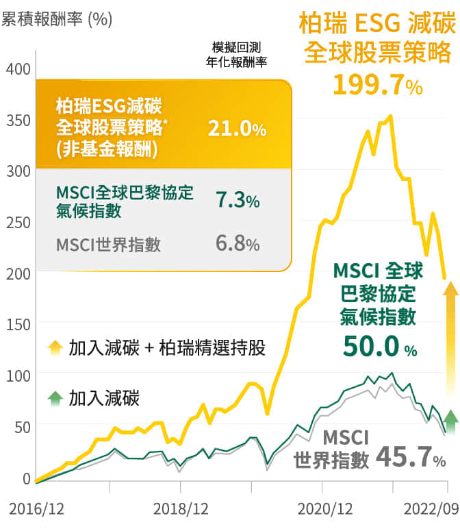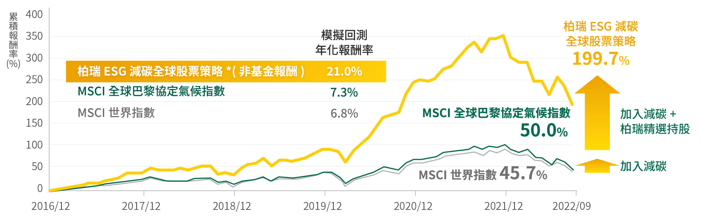資料來源:MSCI,PineBridge Investments,2016/12/31(策略最早成立時間)-2022/9/30,美元計價。*係指柏瑞ESG減碳全球股票策略,透過投資於產品或服務有助減少碳排放量之永續發展企業,以期基金整體有價證券每年減碳比率可達到優於MSCI全球巴黎協定氣候指數(MSCI ACWI Climate Paris Aligned Index)每年之減碳比率為目標。圖文僅供參考,本公司未藉此作任何徵求或推薦。過去績效不代表未來績效之保證,投資人仍需視己身風險承受情況。以上為本基金目前之投資策略及配置,仍將隨市況波動與市場看法而進行調整。資料模擬投資組合之結果,不代表之實際報酬率及未來績效保證,不同時間進行模擬操作,其結果亦可能不同。投資人申購本基金係持有基金受益憑證,而非本文提及之投資資產或標的。本基金設有ESG績效指標為MSCI全球巴黎協定氣候指數,作為年度減碳比率之指標參考,非作為基金績效比較用途。