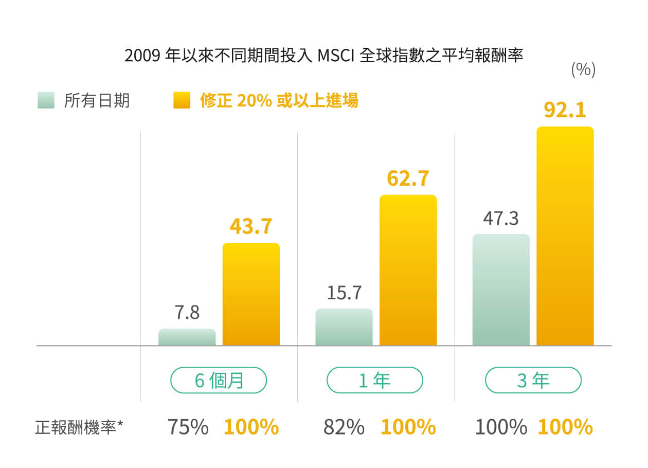 資料來源:(左圖)(右圖)Bloomberg,柏瑞投信整理,2008/12/31-2022/9/30。MSCI世界指數採用MSCI ACWI World Index 。*所有日期正報酬機率為計算2008/12/31開始每日進場後180天、365天與1095天表現,修正20%或以上進場為計算2008/12/31自前波高點跌幅超過20%以上後180天、365天與1095天表現。圖文僅供參考,本公司未藉此作任何徵求、推薦及獲利之保證。投資人仍須視己身風險承受度。投資人申購本基金係持有基金受益憑證,而非本文提及之投資資產或標的。