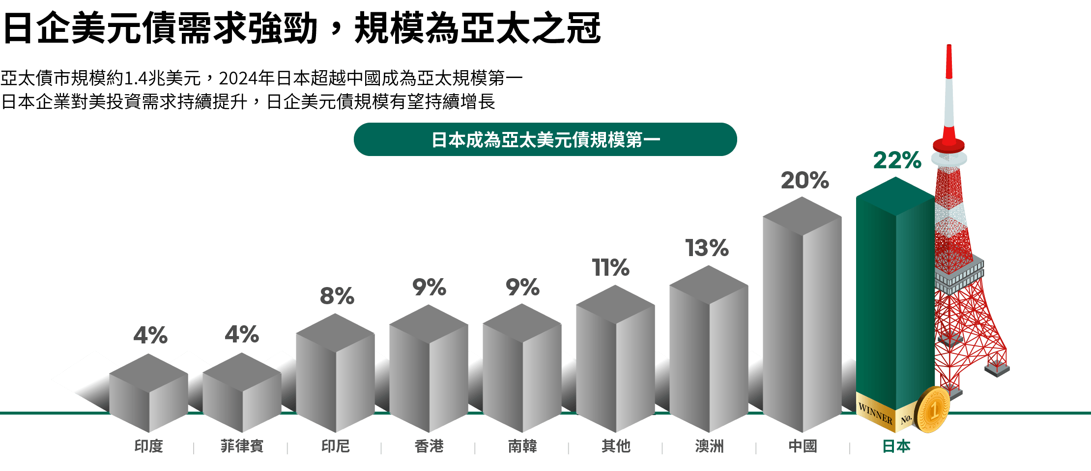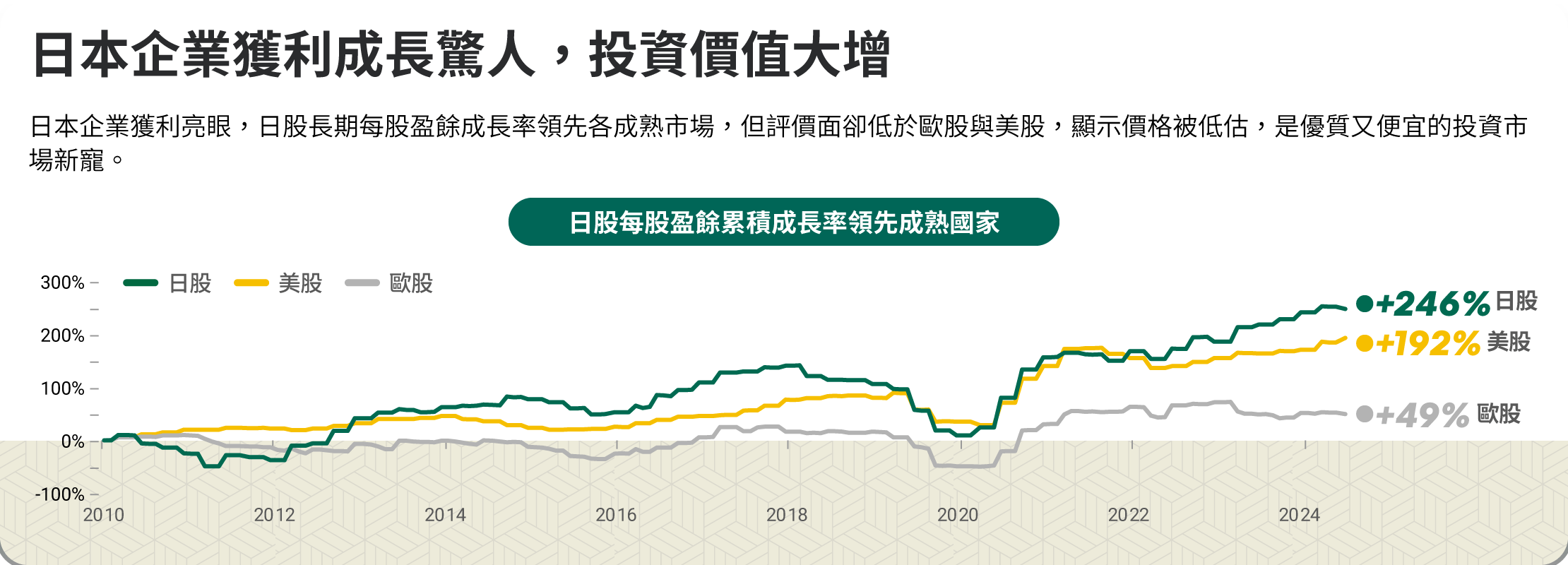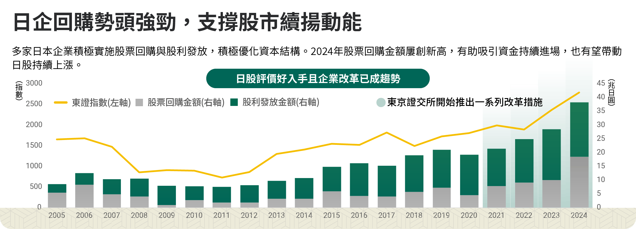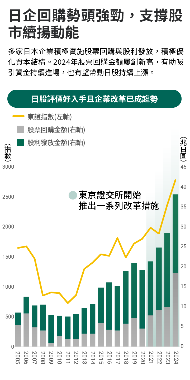 圖文僅供參考,本公司無意藉此作任何徵求或推薦。過去績效不代表未來收益之保證。投資人申購本基金係持有基金受益憑證,而非本文提及之投資資產或標的。資料來源:JPMorgan、Bloomberg,統計2005財年至2024財年,日本財年為每年4月至隔年3月止。