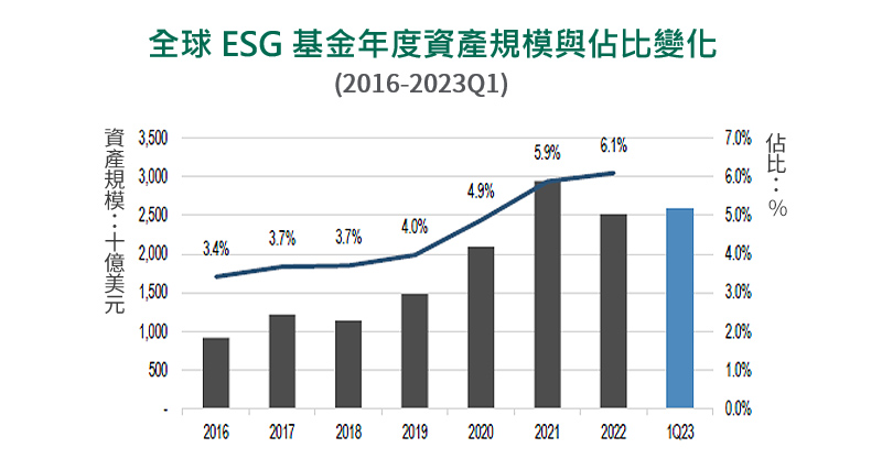 此外,2023年全球ESG資產管理規模比去年底增長,ESG基金相對全球基金的佔比也增加到6%以上。雖然金融市場充滿挑戰,但ESG基金規模也相對穩定,顯示永續投資已成大勢所趨,現在進場正是時候。