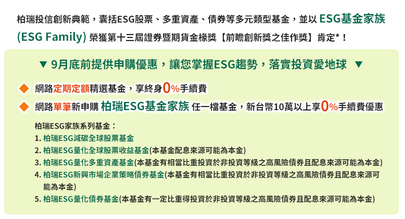 •ESG基金家族的基金包含:柏瑞ESG新興市場企業策略債券基金(本基金有相當比重投資於非投資等級之高風險債券且配息來源可能為本金)、柏瑞ESG量化全球股票收益基金(本基金配息來源可能為本金)、柏瑞ESG量化多重資產基金(本基金有相當比重投資於非投資等級之高風險債券且配息來源可能為本金)、柏瑞ESG量化債券基金(本基金有一定比重得投資於非投資等級之高風險債券且配息來源可能為本金)、柏瑞ESG減碳全球股票基金。