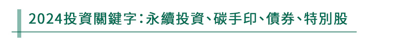 「永續投資、碳手印、債券、特別股」亦將成為2024年投資市場的重要關鍵字,面對嶄新投資環境與全球局勢,投資人必須更聰明謹慎地重新布局,才能在充滿變動與不確定的情況下,啟動確定的投資方程式。