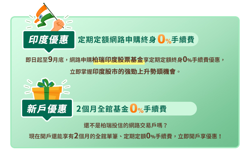 3.優惠內容:精選基金定期定額0%手續費;單筆0.3%手續費,定期定額為終身優惠,終止扣款原優惠將不再適用,恢復扣款適用現行手續費率