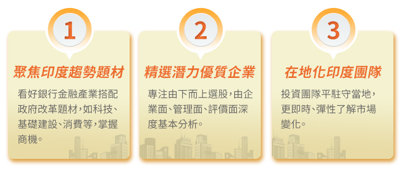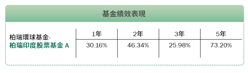 【柏瑞印度股票基金】現階段主要投資於銀行金融產業,搭配政府改革題材,如科技、基礎建設、消費等,經理團隊更依據總體經濟與企業獲利成長表現,分析各產業與景氣的趨勢,採用由下而上的選股方式來挑選具成長潛力的個股建構投資組合,是投資人參與印度多元發展的好選擇,建議以定期定額長期布局,掌握人口紅利與經濟成長爆發力。