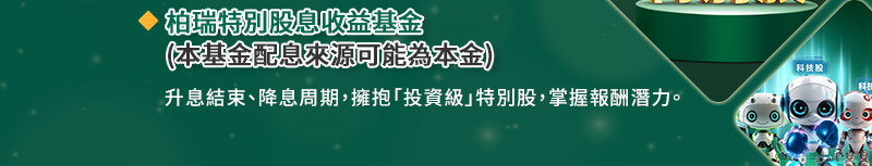 柏瑞特別股息收益基金(本基金配息來源可能為本金)在配息政策上主要是運用所投資之特別股個股,在該公司約定條件下,所發放之現金股利,且該收入多數具有定期給付之特性。基金之配息將視整體基金收益及淨資產價值之情形運作,此配息結果可能涉及本金。